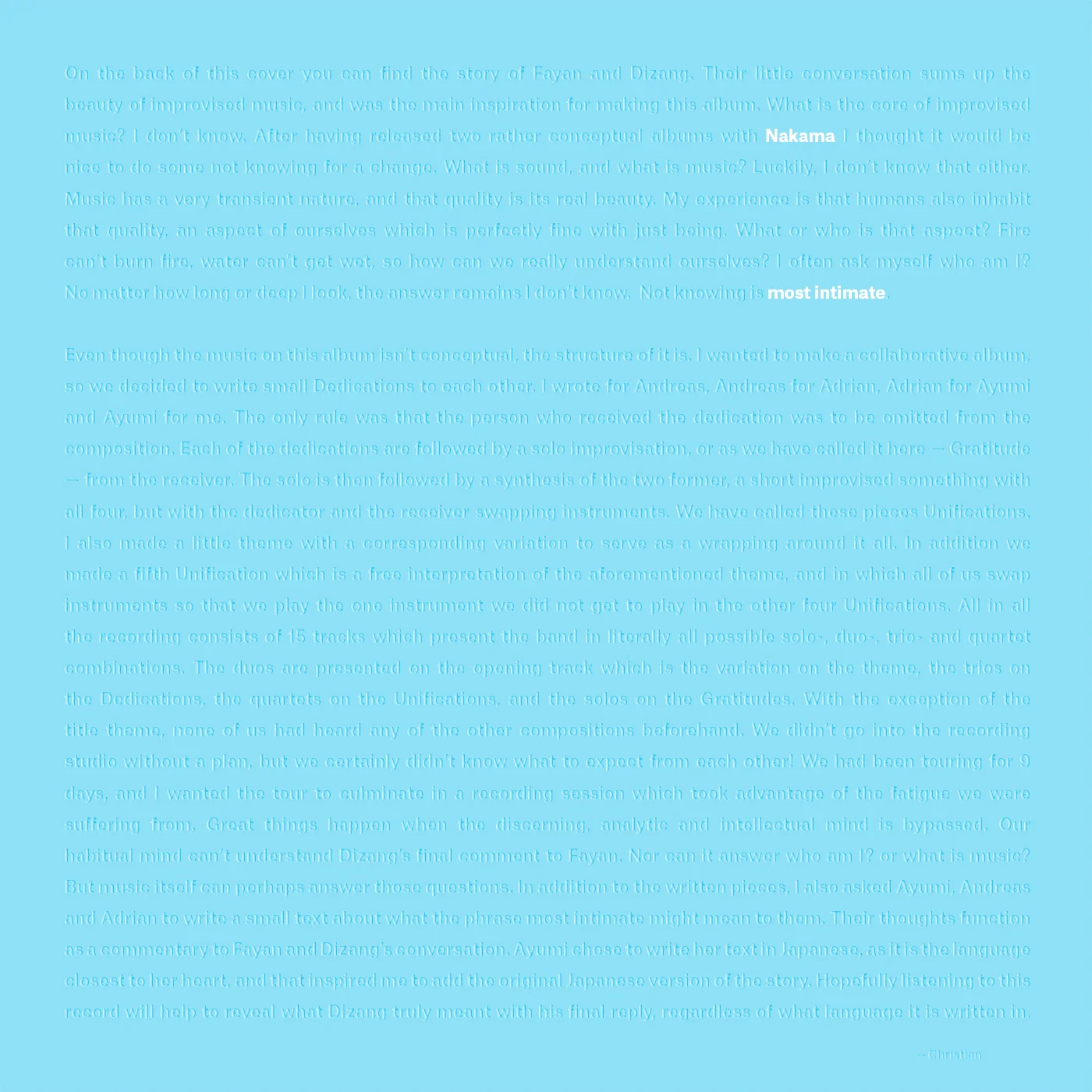 Personnel: Yong Yandsen - tenor saxophone, Christian Meaas Svendsen - double bass, shakuhachi and voice, Paal Nilssen-Love - drums and percussion